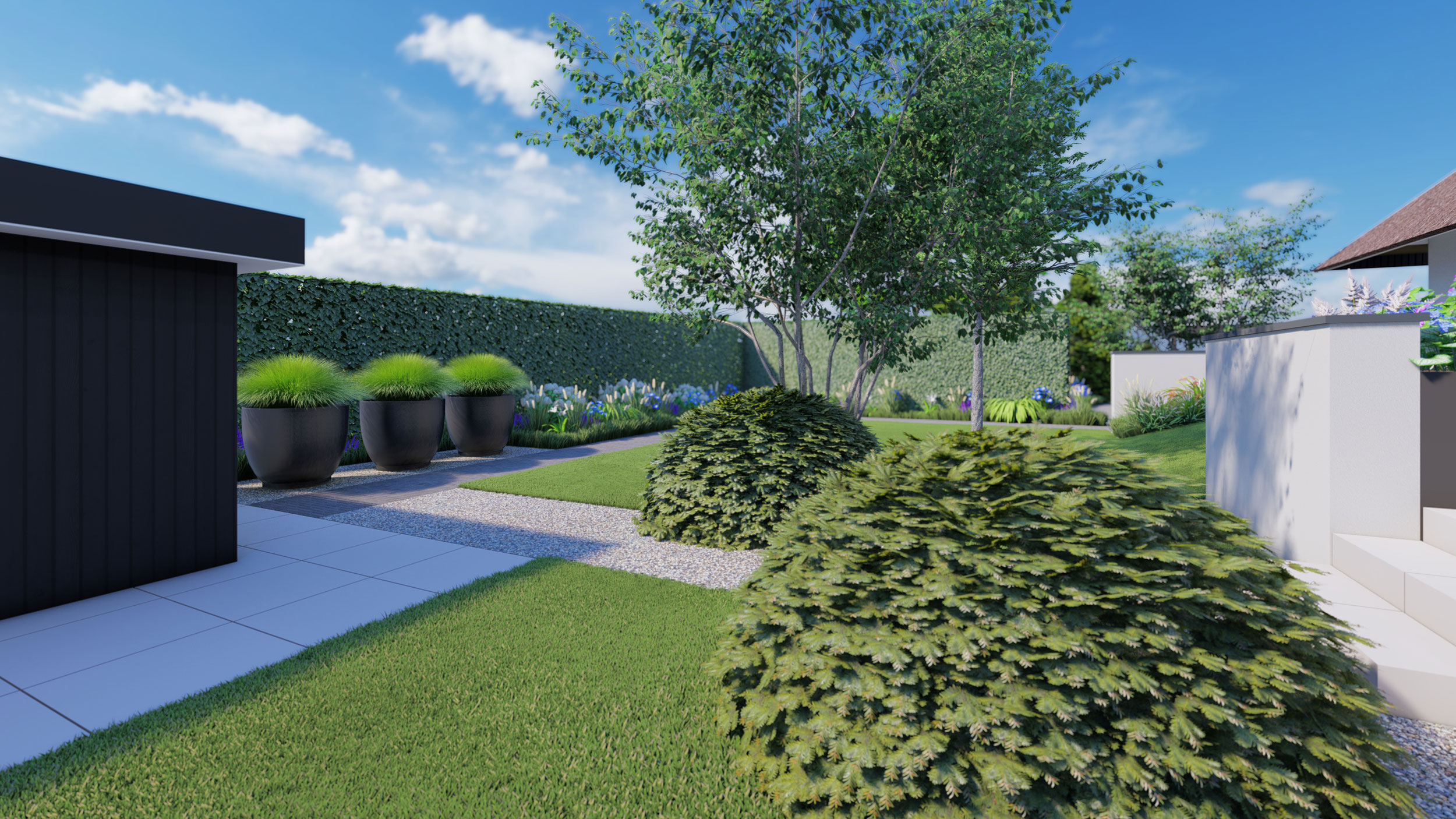 Krachtige zichtassen en een duidelijk lijnenspel zorgen voor verbinding met de natuur en de verschillende verblijven. Een tuin met de WOW-factor!
